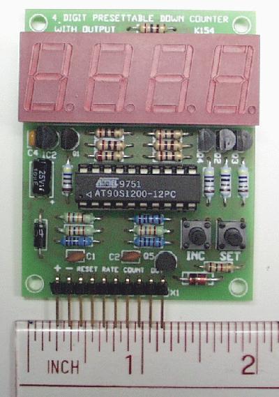 A low cost 4 digit presettable down counter with output and reset. The starting count value can be set using 2 pushbuttons. The counter can be used for both high and low speed counting applications. The counter has 4 operating modes that control how the output behaves when the count reaches zero. A 9 to 12V DC supply is required to power the kit. A 12VDC / 150mA plug pack will do fine. Overall dimensions = 50mm x 63mm (2" x 2.5"). Uses Atmel 90S1200 AVR microcontroller.