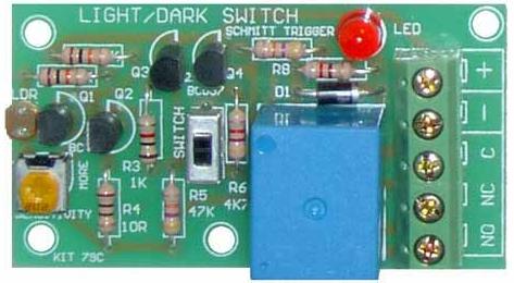 converts the circuit from light to dark switching and vice versa. A small trimpot